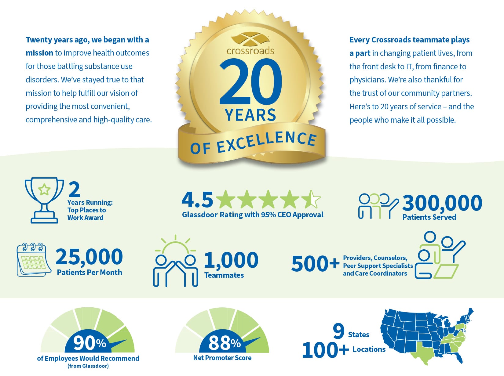 Since 2005, Crossroads has been at the forefront of treating patients with substance use disorder (SUD). Currently operating 100+ centers across nine states, we are a family of doctors, nurse practitioners, counselors and professionals dedicated to providing the most accessible and highest quality treatment options to combat the growing substance and opioid use disorder epidemic.